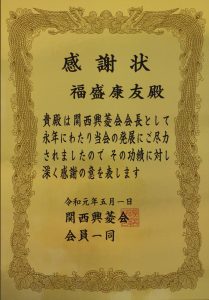 平成31年4月、弊社代表取締役 福盛康友社長が関西興菱会会長を退任しました。