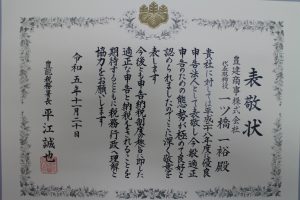 令和5年11月20日、豊能税務署より優良申告法人として表敬状を授与されました。